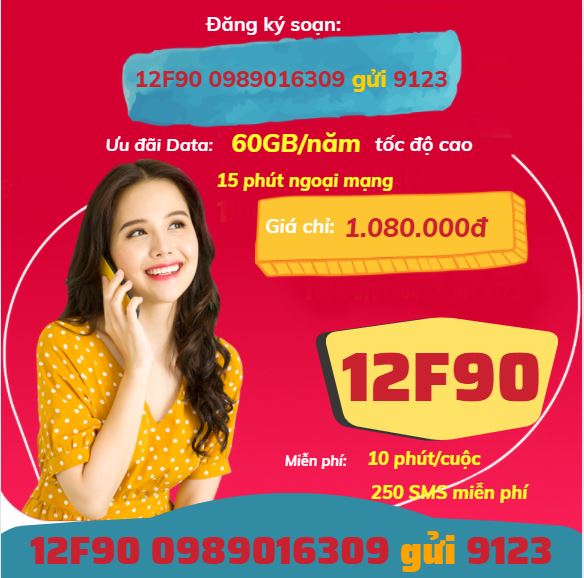 Chỉ với 1.080.000 đồng mà bạn đã có thể sở hữu ngay ưu đãi cực khủng. Nếu bạn là người thường xuyên liên lạc và sử dụng internet thì hãy nhanh tay đăng ký gói cước 12F90 để không mất thời gian gia hạn nhiều lần và tiết kiệm chi phí nhất có thể. Rinh ngay gói 12F90 để hưởng trọn ưu đãi nhé.