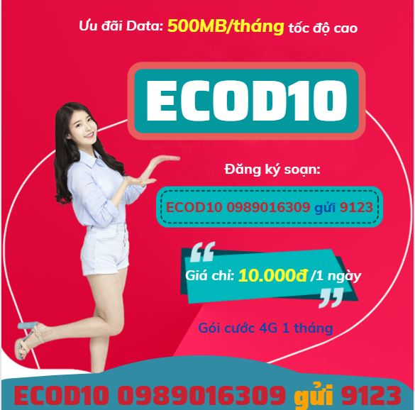 Như vậy, chỉ với 10.000 VNĐ mà bạn đã có thể nhận ngay 500MB data dùng trong 1 tháng. Gói cước ECOD10 rất thích hợp với nhiều đối tượng thuê bao dùng ít mạng. Nhanh tay rinh về gói ECOD10 để hưởng trọn ưu đãi tuyệt vời từ nhà mạng viễn thông Viettel bạn nhé.