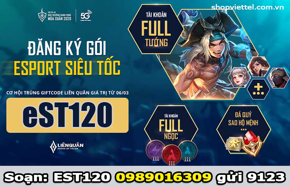 Gói cước EST120 của Viettel ra mắt dành cho những tín đồ chơi game Liên Quân Mobile thường xuyên. Dưới đây sẽ là thông tin chi tiết nhất về gói EST120 của Viettel mà shopviettel.com.vn gửi tới bạn.